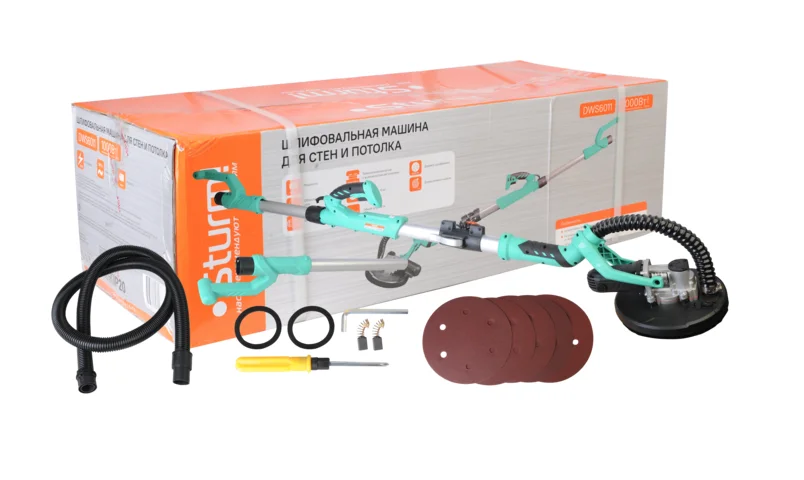 Шлифовальная машина для стен и потолка Sturm! DWS6011 — компактный и удобный электроинструмент для сухого шлифования штукатурки, гипсокартона и тому подобных материалов. В силу своего малого веса и регулируемой телескопической ручки, данная модель, обладает изрядной практичностью в своем применении. Также, на деле, выгодным отличием оказывается надежная защита электродвигателя от пыли.