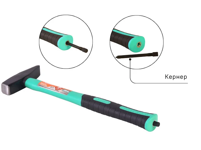Уникальная запатентованная система крепления кернера позволяет хранить его прямо в рукоятке. Переход от основной работы к разметке и обратно стал максимально быстрым, что в разы экономит время. Кованый боёк молотка, защита от раскола, обрезиненная фиберглассовая рукоятка амортизирует удар и создаёт удобный захват.