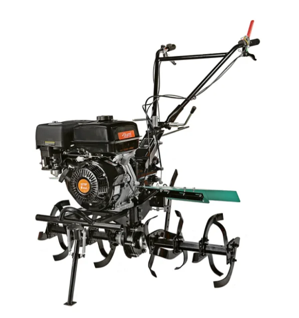 Мотоблок Sturm! GK8210GP — это агрегат тяжелого класса, предназначенный для выполнения больших объемов культивационных работ на обширных площадях. Модель данной категории способна работать в непрерывном режиме с активным и пассивным навесным оборудованием. Мотоблок оснащен мощным 4-х тактный одноцилиндровым двигателем, мощностью 9 л.с. объемом 270 см3 и многоступенчатым редуктором, которые позволяют обрабатывать, за один проход, полосу земли шириной 1 м. При использовании пневматических колес, мотоблок с легкостью управляется с прицепом.