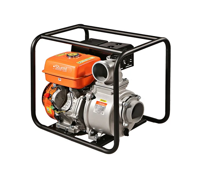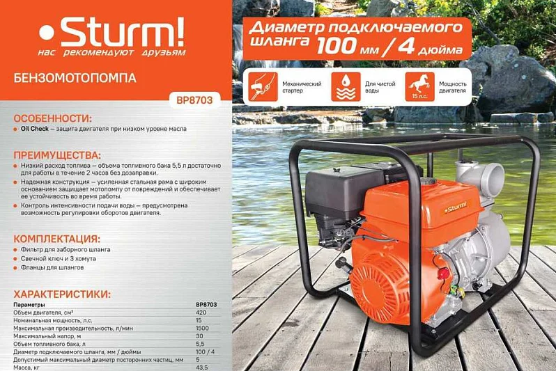 Бензиновая мотопомпа Sturm! BP8703 производительностью 1500 л/мин, с двигателем мощностью 15 л. с. и штуцерами диаметром 4 дюйма, осуществляет забор воды с глубины до 7 м, обеспечивает напор до 30 м и используется для подачи чистой воды на дачный участок, стройку, небольшое предприятие или в системы полива. Также легко справляется с осушением водоемов, бассейнов и затопленных помещений. Бензиновая мотопомпа работает автономно, и ее можно использовать для выездных работ.