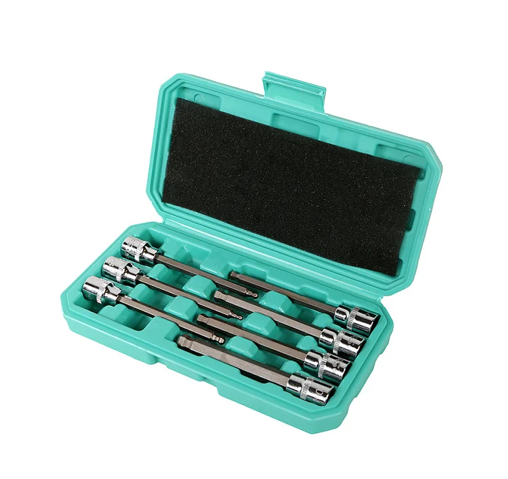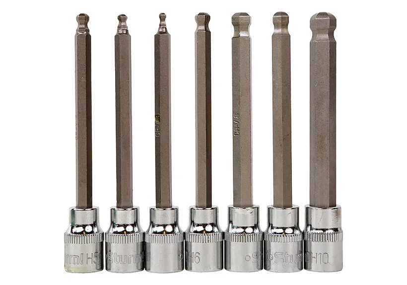 Набор голвок используется автомобилистами, слесарями, мастерами для обслуживания транспортных средств или в быту при работе с шестигранным крепежом. В комплект входит 7 головок с посадкой 3/8". Форма наконечника шар.
