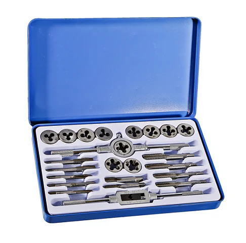 Включает метчики и плашки для нарезания популярных размеров метрических резьб. Укомплектован воротками для метчиков и плашек.