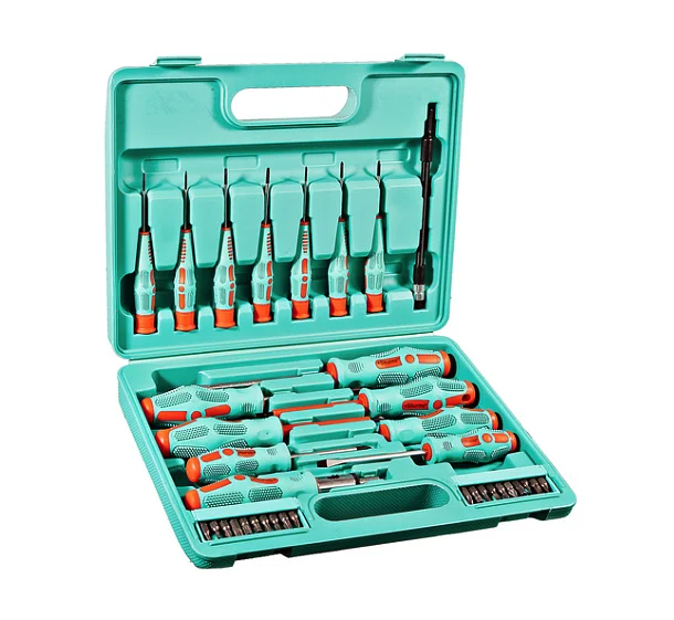 Рабочие части изготовлены из хромованадиевой стали, что позволяет работать при высоких нагрузках.В комплект входит трещоточная отвертка и набор отверток для точной механики.