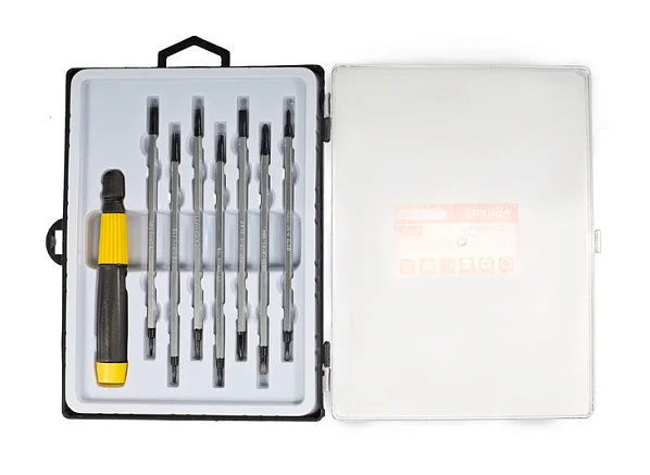7 двухсторонних бит и рукоятка: TORX: 5,6,7,8,9,10,15,20 PH: 00,0,1 SL:2,3,4