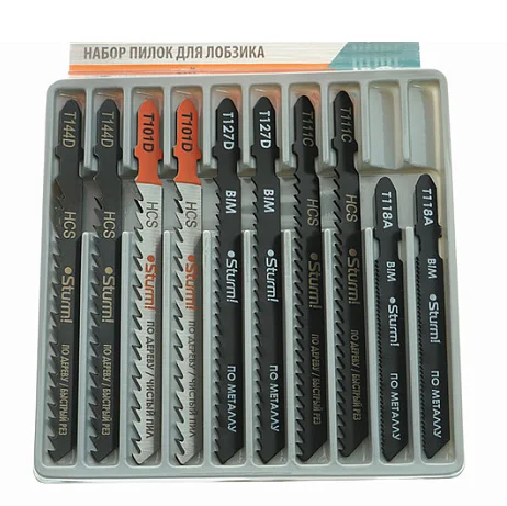 T-образный хвоствик позволяет использовать пилки с любыми марками лобзиков. Универсальный набор для дерева, металла и пластика позволяет с легкостью подобрать пилку для любого вида работ. Комплектация 10шт:
