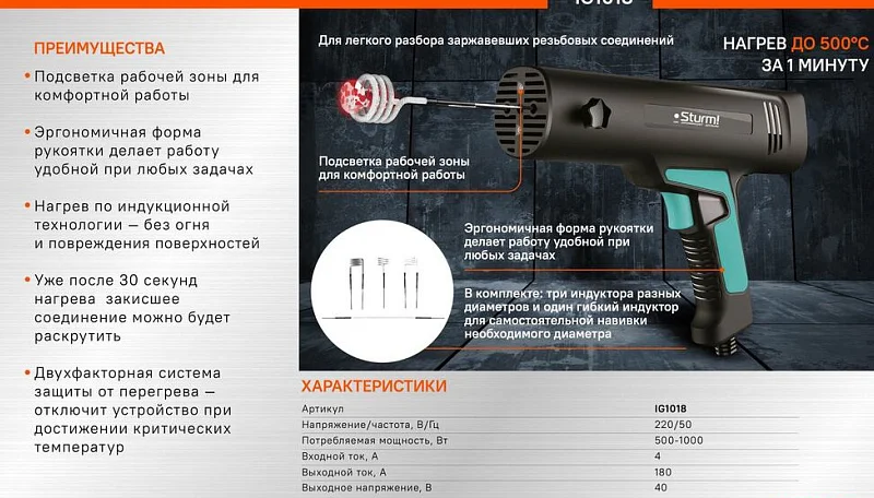 Нагреватель индукционный Sturm! IG1018 предназначен для разблокировки ржавых, поддавшихся коррозии, соединений, гаек, болтов, а также для нагрева и сгибания металлических прутков. Индукционный нагреватель преобразует электрическую энергию в высокочастотное переменное магнитное поле. Это магнитное поле, взаимодействуя с металлической токопроводящей рабочей области заставляет электроны в металле вибрировать, согласно принципу электромагнитной индукции. Кинетическая энергия движущихся электронов переходит в тепловую, которая нагревает метал.
