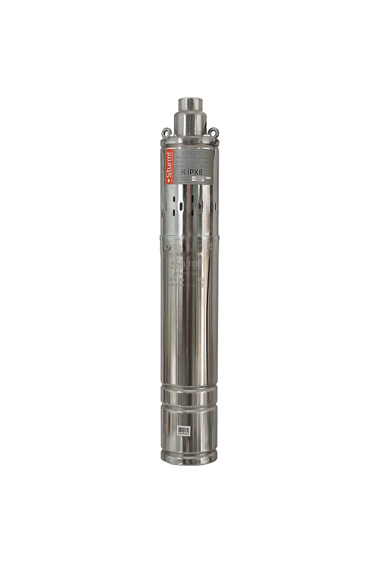 Sturm! WP9705DWI – погружной скважинный винтовой насос – предназначен для перекачивания чистой воды без песка или иных примесей из относительно неглубоких, узких скважин. Обладает небольшими габаритными размерами, благодаря чему удобен в транспортировке. Корпус устройства изготовлен из нержавеющей стали и стоек к воздействию агрессивной среды, и механическим повреждениям. Модель оснащена 550 Вт электродвигателем и рабочим элементом в виде винта-шнека – характеризуется высокой производительностью, и способна перекачивать за час до 1500 литров воды, обеспечивая ее подачу на высоту до 90 метров, осуществляя забор с глубины до 30 метров. Максимальная температура перекачиваемой воды не должна превышать 40 °C. Двигатель насоса имеет масляное охлаждение, что способствует его малому износу в процессе эксплуатации. Также, в конструкции Sturm! WP9705DWI предусмотрена термозащита – она отключает питание при перегреве и позволяет возобновить работу при остывании устройства до рабочей температуры. Наличие длинного 20-ти метрового кабеля питания дает возможность установить насос на необходимой глубине погружения.