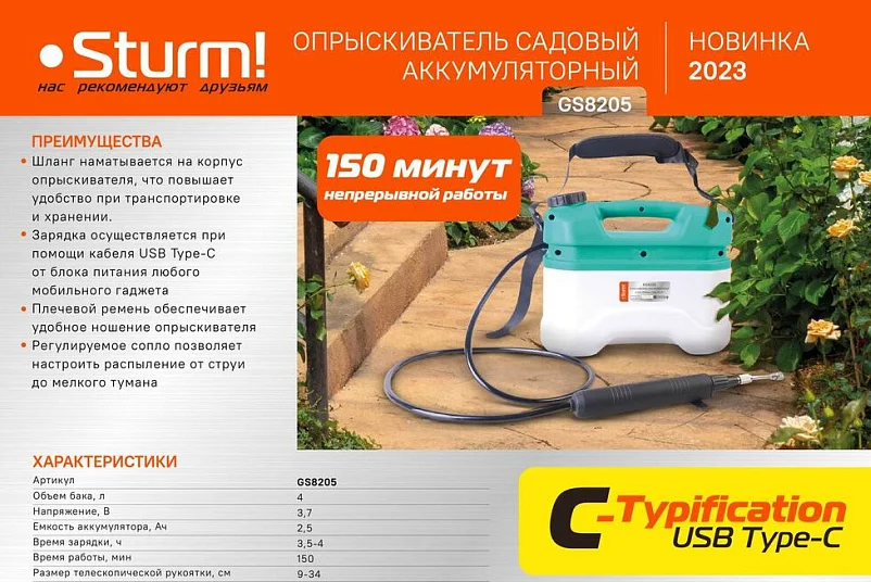 За счет Li-Ion аккумулятора, встроенного в корпус, опрыскиватель имеет более компактный размер, чем аналоги со свинцово-кислотным аккумулятором. Заряд аккумулятора осуществляется от зарядного устройства для вашего смартфона кабелем с современным и самым распространенным коннектором USB type C.