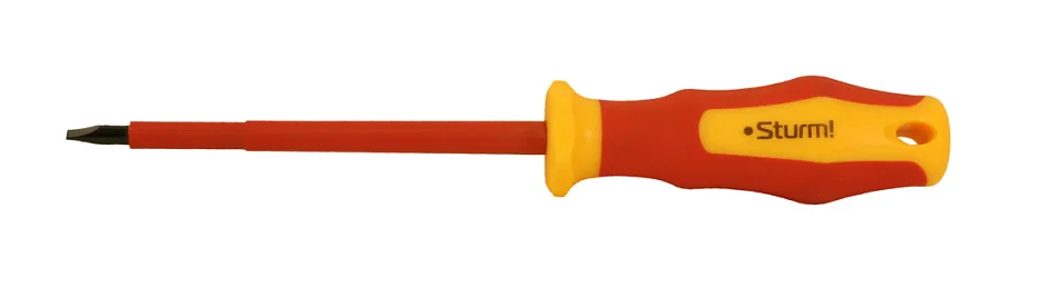 Отвертка Sturm! 1040-17-SL4-100 с многокомпонентной ручкой эргономичной ручкой. Отвертка для безопасной работы на оборудовании с максимально допустимым напряжением 1000 В. Многогранный край ручки для защиты от перекатывания отвёртки на рабочем месте.