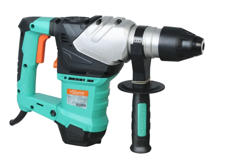 Sturm RH2517 – универсальный и производительный трехрежимный перфоратор. Являясь представителем семейства перфораторов вертикальной компоновки, инструмент воплощает в себе все основные, присущие компоновке этого типа достоинства – возможность установки мощного двигателя при сохранении компактных габаритных размеров устройства, нейтральный центр тяжести, способность выдерживать повышенные нагрузки. Модель Sturm RH2517 оснащена производительным 1700-ваттным электромотором с дополнительным бронированием, защищающим от абразивных частиц и пыли и усиленным ударным механизмом, развивающим энергию удара в 5.5 Дж – это позволяет с легкостью бурить отверстия до 32 мм в материалах различной твердости, использовать коронки больших диаметров ( бетон до 65 мм / кирпич до 80 мм), проводить операции по демонтажу. Изготовленный из литого алюминия корпус редуктора способствует лучшему отводу тепла от шестерен и элементов ударного механизма. Инструмент имеет три режима работы – в зависимости от поставленной задачи пользователь выбирает нужный: сверление, сверление с ударом, либо режим удара. Режим удара активируется отдельным переключателем, размещенным напротив пусковой клавиши, что позволяет включать / выключать удар одним движением. Для безопасности пользователя в конструкции перфоратора применена предохранительная кулачковая муфта, исключающая опасность проворачивания инструмента в руках при заклинивании оснастки в материале.