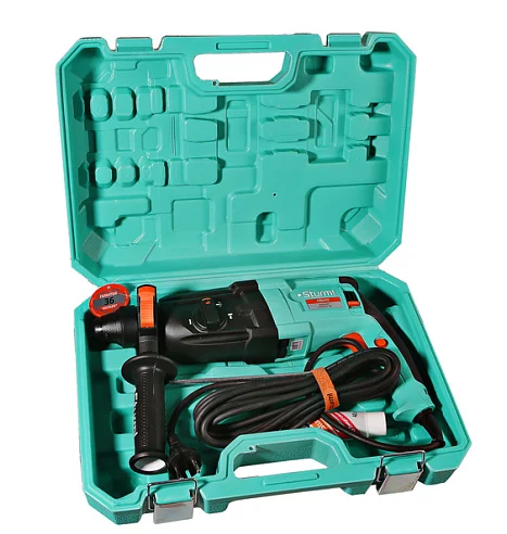 Sturm RH2524BR – универсальный трехрежимный перфоратор c патроном под оснастку SDS Plus. Имеет классическую горизонтальную компоновку с продолговатым узким корпусом и небольшую массу, за счет чего максимально удобен при высотных работах, а также при эксплуатации в условиях с ограниченным доступом. Корпус инструмента выполнен из высококачественного пластика с применением нейлона и демонстрирует хорошую стойкость к ударам и воздействию низких температур Модель оснащена электродвигателем мощностью 800 Вт и усиленным вакуумно-компрессионным механизмом, развивающим энергию удара – 3.0 Дж – это дает возможность уверенно бурить отверстия диаметром до 24 мм в материалах различной твердости, включая кирпичную кладку, камень и бетон. Наличие функции реверса с подпружиненным механизмом поворота щеточного узла позволяет сохранять одинаковую мощность при любом направлении вращения и исключить случайные переключения во время использования Перфоратор Sturm RH2524BR является трехрежимным – в зависимости от конкретной задачи пользователь выбирает нужный: сверление, сверление с ударом, либо режим удара. Также, предусмотрен отдельный режим, дающий возможность установки долота в любом угловом положении. Для безопасности пользователя в перфораторе установлена предохранительная кулачковая муфта SafetyClutch, гарантирующая защиту от обратного удара в случае заклинивания оснастки. Сетевой кабель 4VelcroRubber имеет резиновую изоляцию, что сохраняет его гибкость и эластичность в условиях низких температур, а четырехметровая длина кабеля дает возможность использовать инструмент без применения дополнительного сетевого удлинителя, обеспечивая рабочую зону площадью до 50 м2. Инструмент штатно комплектуется вместительным пластиковым кейсом для удобства хранения и транспортировки.