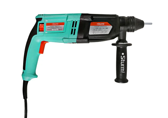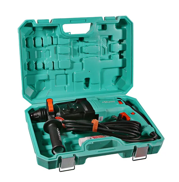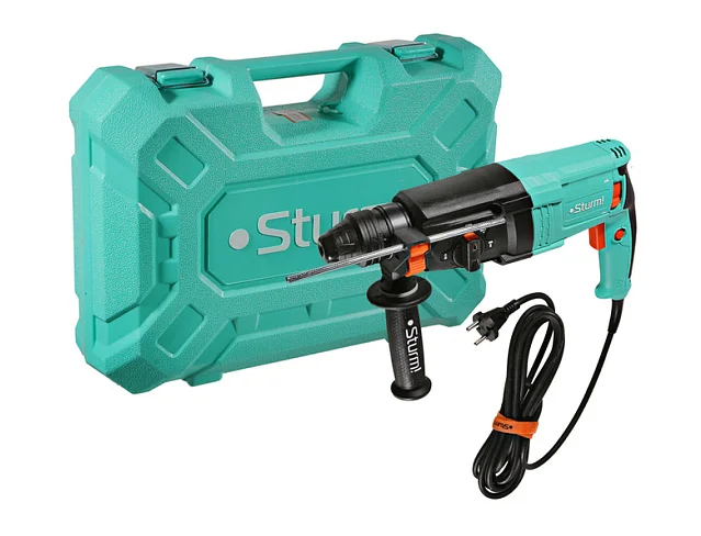 Sturm RH2526BR – универсальный трехрежимный перфоратор c патроном под оснастку SDS Plus. Имеет классическую горизонтальную компоновку с продолговатым узким корпусом и небольшую массу, за счет чего максимально удобен при высотных работах, а также при эксплуатации в условиях с ограниченным доступом. Корпус инструмента выполнен из высококачественного пластика с применением нейлона и демонстрирует хорошую стойкость к ударам и воздействию низких температур Модель оснащена электродвигателем мощностью 920 Вт и усиленным вакуумно-компрессионным механизмом, развивающим энергию удара – 3.0 Дж – это дает возможность уверенно бурить отверстия диаметром до 26 мм в материалах различной твердости, включая кирпичную кладку, камень и бетон. Наличие функции реверса с подпружиненным механизмом поворота щеточного узла позволяет сохранять одинаковую мощность при любом направлении вращения и исключить случайные переключения во время использования Перфоратор Sturm RH2526BR является трехрежимным – в зависимости от конкретной задачи пользователь выбирает нужный: сверление, сверление с ударом, либо режим удара. Также, предусмотрен отдельный режим, дающий возможность установки долота в любом угловом положении. Для безопасности пользователя в перфораторе установлена предохранительная кулачковая муфта SafetyClutch, гарантирующая защиту от обратного удара в случае заклинивания оснастки. Сетевой кабель 4VelcroRubber имеет резиновую изоляцию, что сохраняет его гибкость и эластичность в условиях низких температур, а четырехметровая длина кабеля дает возможность использовать инструмент без применения дополнительного сетевого удлинителя, обеспечивая рабочую зону площадью до 50 м2. Инструмент штатно комплектуется вместительным пластиковым кейсом для удобства хранения и транспортировки.