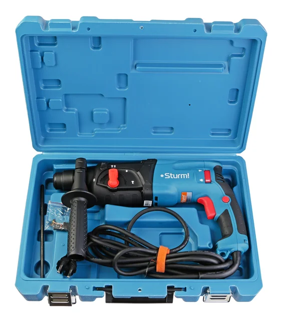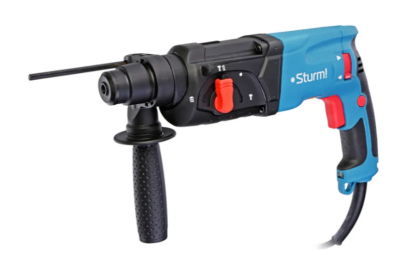 Sturm RH2510PM – универсальный трехрежимный перфоратор профессиональной серии инструмента Sturm. В сравнении с бытовыми DIY моделями обладает повышенной надежностью и ресурсом. Оснащен двигателем мощностью 1000 Вт с дополнительным бронированием, защищающим от абразивных частиц и пыли, усиленным вакуумно-компрессионным механизмом (энергия удара – 2.9 Дж), высококачественными фирменными подшипниками, механизмом реверса с поворотным щеткодержателем – данное техническое решение способствует увеличению срока службы щеток, а также позволяет развивать максимальные обороты на валу при прямом, так и реверсивном вращении. Инструмент удобен в использовании: благодаря узкому продолговатому корпусу позволяет работать в стесненных условиях, а небольшая масса перфоратора (2.9 кг) способствует лучшему его контролю и позволяет при необходимости, например, при работах на высоте, легко удерживать инструмент одной рукой. Удобство хвата обеспечивают прорезиненные накладки на корпусе и дополнительная рукоять с возможностью установки под любым углом.