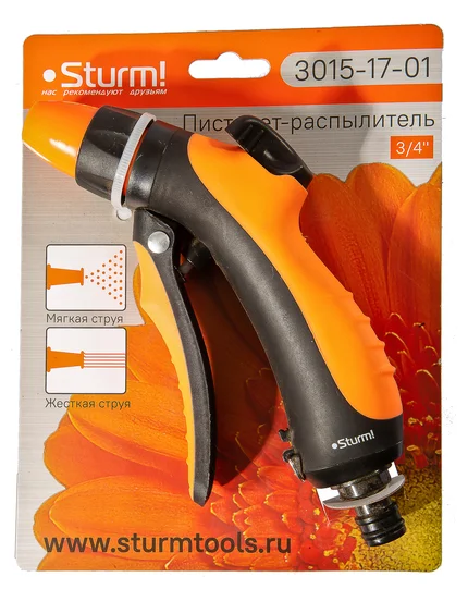 Пистолет для полива Sturm! 3015-17-01 используется для полива садовых и огородных участков, а также применяется в парках и скверах. Пистолет для полива сочетает в себе надежное исполнение, эргономичный дизайн. Изготовлен из высококачественных материалов для обеспечения длительного срока эксплуатации. Подходит для бережного и деликатного орошения участков, растений, не причиняющет вреда растениям при поливе.