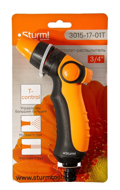 Пистолет для полива Sturm! 3015-17-01T используется для полива садовых и огородных участков, а также применяется в парках и скверах. Пистолет для полива сочетает в себе надежное исполнение, эргономичный дизайн. Изготовлен из высококачественных материалов для обеспечения длительного срока эксплуатации. Подходит для бережного и деликатного орошения участков, растений, не причиняющет вреда растениям при поливе.