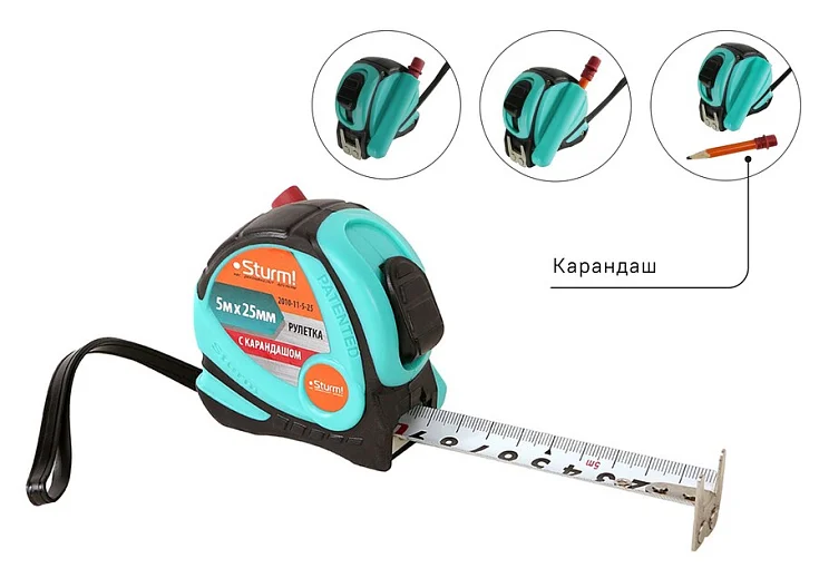 Корпус рулетки оснащён уникальным пеналом, благодаря чему карандаш будет всегда под рукой. Переход от замеров к разметке осуществляется максимально быстро!
