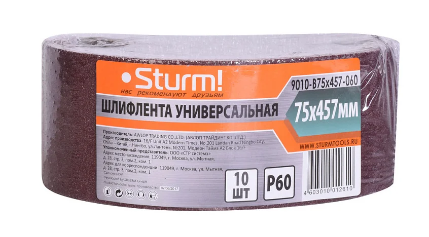 Шлифлента, 75x457мм, Р60, 10 шт, Sturm! 9010-B75x457-060