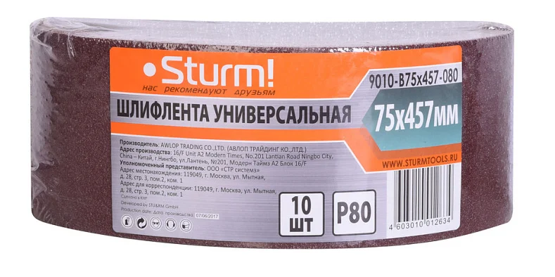 Шлифлента, 75x457мм, Р80, 10 шт, Sturm! 9010-B75x457-080