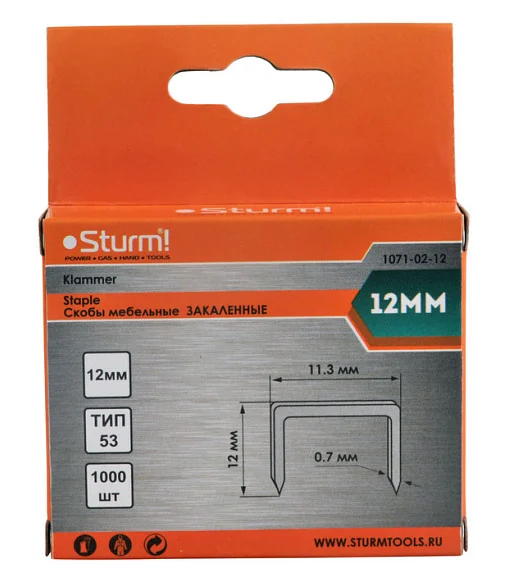 Скобы для мебельных степлеров изготовлены из конструкционной стали и закалены для повышения твердости. Имеют заостренные шипы. Наиболее популярный размер - ширина 11,3 мм (тип 53). Картонная пачка с отверстием для крепления на стенде. В пачке 1000 штук