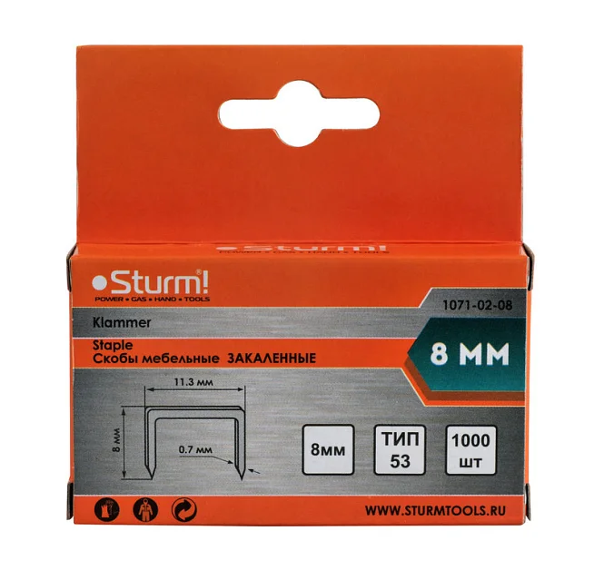 Скобы для мебельных степлеров изготовлены из конструкционной стали и закалены для повышения твердости. Имеют заостренные шипы. Наиболее популярный размер - ширина 11,3 мм (тип 53). Картонная пачка с отверстием для крепления на стенде. В пачке 1000 штук