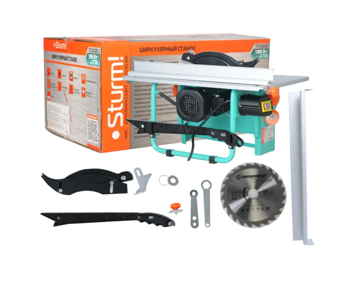 Станок, пильный диск, набор инструментов, толкатель заготовок, ручки фиксации параллельного упора ( 2 шт.), защитный кожух, нож расклинивающий, направляющая планка, боковой упор, угловой упор, патрубок пылеотвода, инструкция по эксплуатации.