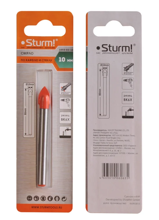 Сверло по стеклу и кафелю, 10мм, круглый хвостовик, 2 грани, Sturm! 1055-03-10