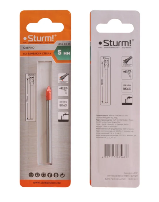 Сверло по стеклу и кафелю, 5мм, круглый хвостовик, 2 грани, Sturm! 1055-03-05