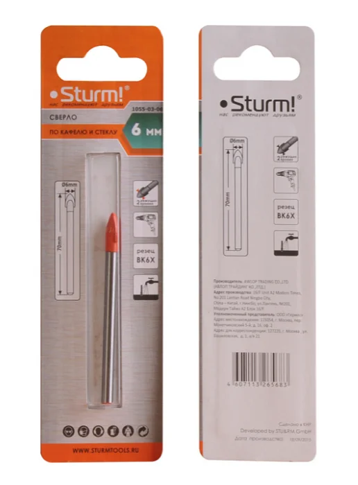 Сверло по стеклу и кафелю, 6мм, круглый хвостовик, 2 грани, Sturm! 1055-03-06