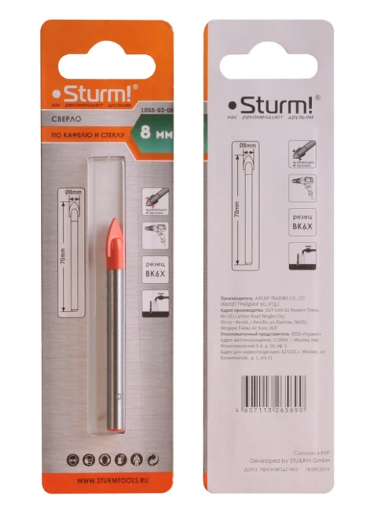 Сверло по стеклу и кафелю, 8мм, круглый хвостовик, 2 грани, Sturm! 1055-03-08