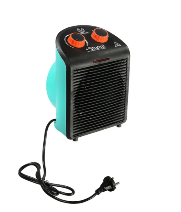 Sturm FH2001 – мобильный тепловентилятор мощностью 2 кВт –предназначен для вспомогательного обогрева жилых помещений площадью до 20 м2. Модель выполнена в современном, интерьерном дизайне и отличается минимальными габаритами, и весом. Обогреватель оснащен надежным и долговечным спиральным нагревательным элементом, обеспечивающим быстрый и равномерный прогрев помещения. Для того, чтобы обеспечить высокую производительность воздушного потока, проходящего через нагревательный элемент и ускорить циркуляцию нагретого воздуха, устройство имеет встроенный мощный вентилятор. Управление обогревателем осуществляется с помощью пары регуляторов, размещенных на верхней панели. С помощью первого регулятора пользователь выбирает один из трех режимов работы: вентиляция без нагрева / теплый обдув / горячий обдув. Второй регулятор отвечает за настройку термостата. Для визуального контроля включенного устройства, предусмотрен отдельный индикатор питания. Безопасность использования обеспечивают встроенная термозащита и корпус из жаропрочного пластика.