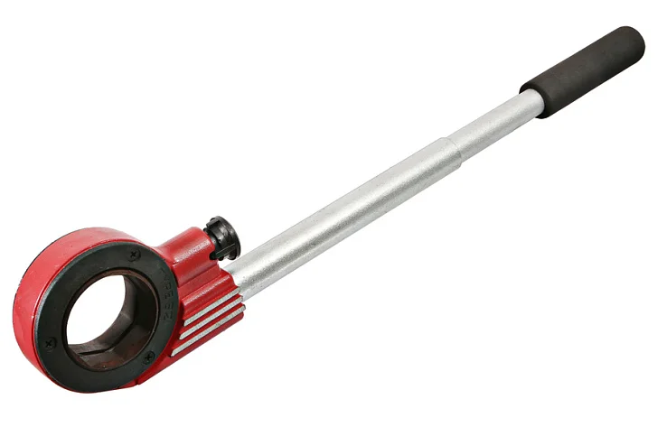 Преимущества: Трещотка изготовлена из высококачественной инструментальной стали, что, в сочетании с усиленным механизмом трещотки, позволяет при необходимости применять большие нагрузки. Оснащена телескопической рукояткой для удобства работы даже в ограниченном пространстве. Головка плотно обхватывает клупп, что обеспечивает качественное выполнение работы.