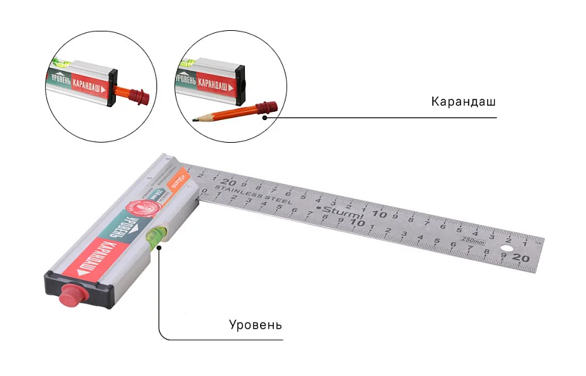 Переход от замера к разметке и обратно стал максимально быстрым, что в разы экономит время в процессе работы. Крепление осуществляется специально разработанной резиновой втулкой, которая надёжно удерживает карандаш, а так же позволяет его быстро извлечь и вернуть на место, исключая возможную потерю. Колба пузырькового уровня из ударопрочного плексигласа, полотно из нержавеющей стали с антикоррозийным покрытием, гравированная шкала устойчива в внешнему воздействию и сохранению точных показаний
