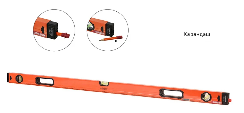 С карандашом, уникальная запатентованная система позволяет хранить карандаш прямо в корпусе уровня, благодаря чему он будет всегда под рукой. Переход от замера к разметке и обратно стал максимально быстрым, что в разы экономит время в процессе работы. Крепление осуществляется специально разработанной резиновой втулкой, которая надёжно удерживат карандаш, а так же позволяет его быстро извлечь и вернуть на место, исключая возможную потерю. 3 высокоточные колбы из ударопрочного плексигласа, литой цельнометаллический профиль, стойкость к ударам, фрезерованная поверхность для лучшего сцепления и увеличения точности измерения, магнит, измерительная шкала, ручки для переноса.