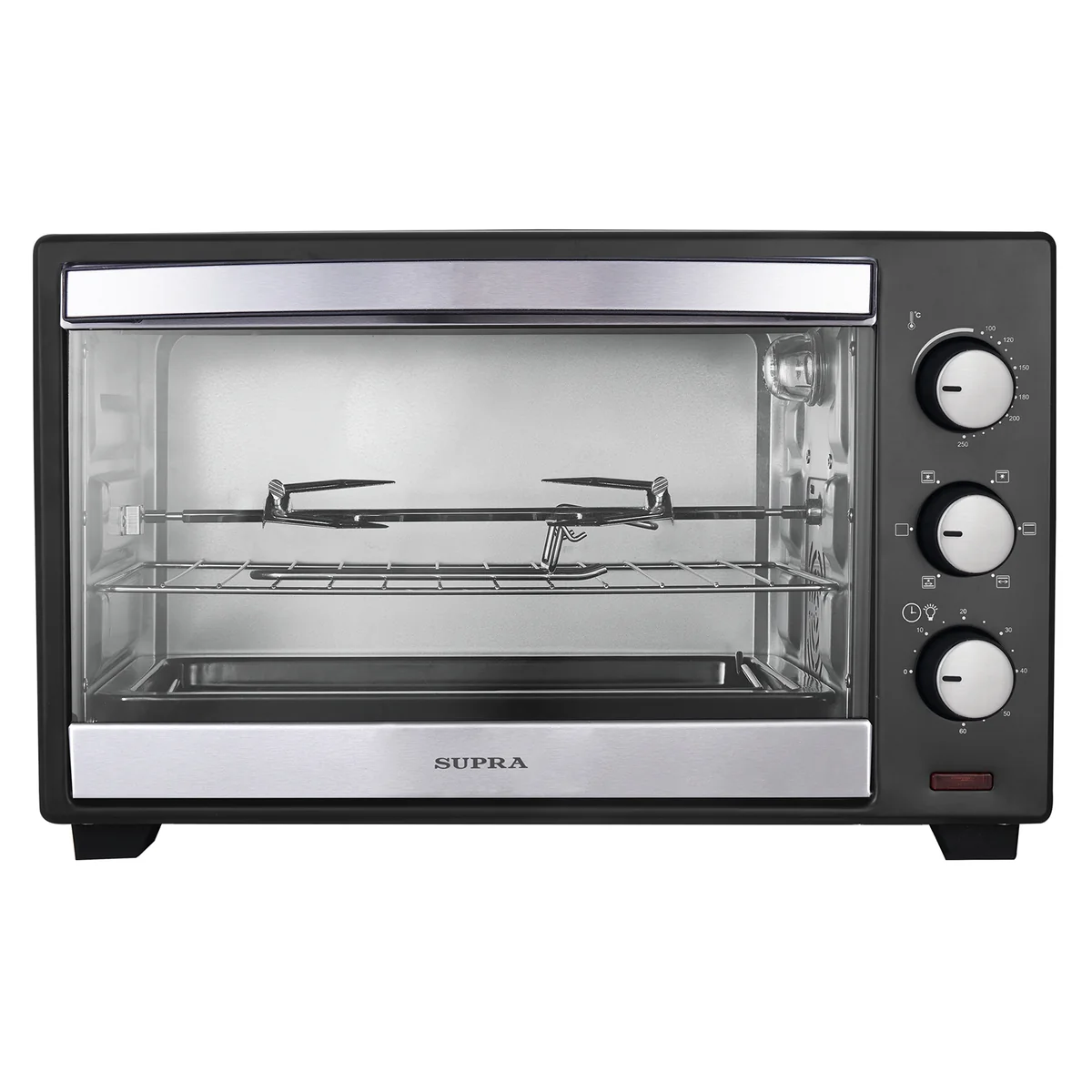 электропечь, металлическая решетка, плоский противень, круглая форма для пиццы, ухват для противня, вертел, ухват для вертела, гарантийный талон, инструкция на русском языке