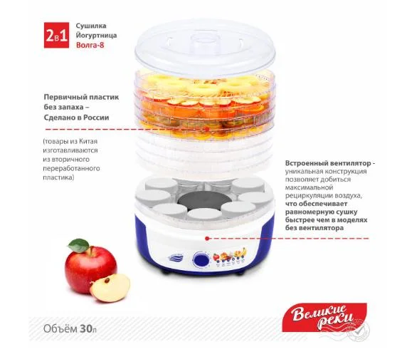 Позволяет сушить фрукты, овощи, грибы, мясо, травы, а также делать йогурты и десерты. Сохраняет все витамины и полезные микроэлементы. Мощность 500 Вт, 8 прозрачных поддонов (2 из которых со съемной сеткой), что дает возможность устанавливать емкости для приготовления йогурта ( до 9 стеклянных баночек). 2 рабочих объема. Диаметр прозрачных поддонов 33 см, высота до 40 мм. Сушилка Волга-8 сделана из первичного пищевого пластика, не шумит, имеет терморегулятор. Есть возможность выбора нужной температуры сушки от 35 до 70 градусов. Имеется встроенный вентилятор. 2 года гарантии.Рецепты внутри инструкции. Цветная коробка. Размер прибора: 330х350х355мм (ШхГхВ). Вес нетто: 3,37 кг. Вес брутто: 4 кг. Размер транс. упак. 700х360х370 мм. Класс защиты от поражения электрическим током II.
