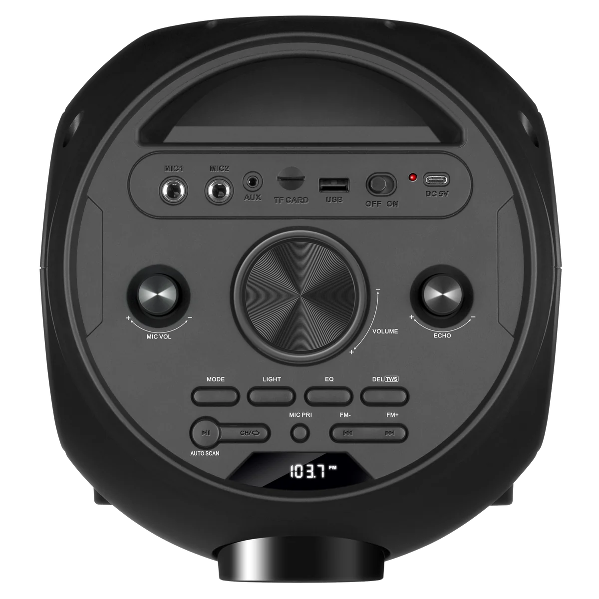 За воспроизведение звука отвечают два высокочастотных динамика диаметром 32 мм, а также средне- и низкочастотные — по 145 мм каждый. Танцевальные треки звучат как нужно — с глубокими басами, которые не мешают наслаждаться вокалом и партиями солирующих инструментов. Да и музыка других жанров тоже порадует меломанов. Подстроить звук под себя поможет встроенный эквалайзер, а разноцветная динамическая подсветка поддержит нужное настроение и добавит вашему танцполу ярких красок. Необходимая информация о работе колонки отображается на контрастном LED-дисплее, а управлять всеми функциями можно с помощью пульта — вам даже не придется подходить к устройству.