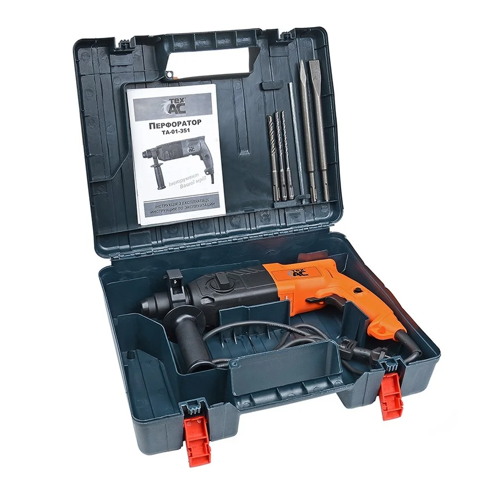 Перфоратор ТехАС ТА-01-351 — надежный инструмент бытового класса, применяемый в строительстве и ремонте.Предназначен для проделывания отверстий в различных твердых материалах: камне, кирпиче, бетоне.В режиме долбления перфоратор используется для демонтажа плитки, штукатурки, проделывания штроб.Значительно расширяет сферу применения инструмента режим сверления, благодаря которому, поставив кулачковый патрон, можно сверлить металл, пластик или дерево.Перфоратор имеет мощный электромотор — 1100 Вт, что дает возможность работать с самыми твердыми материалами.Благодаря наличию функции реверса, есть возможность высвободить застрявшее сверло.