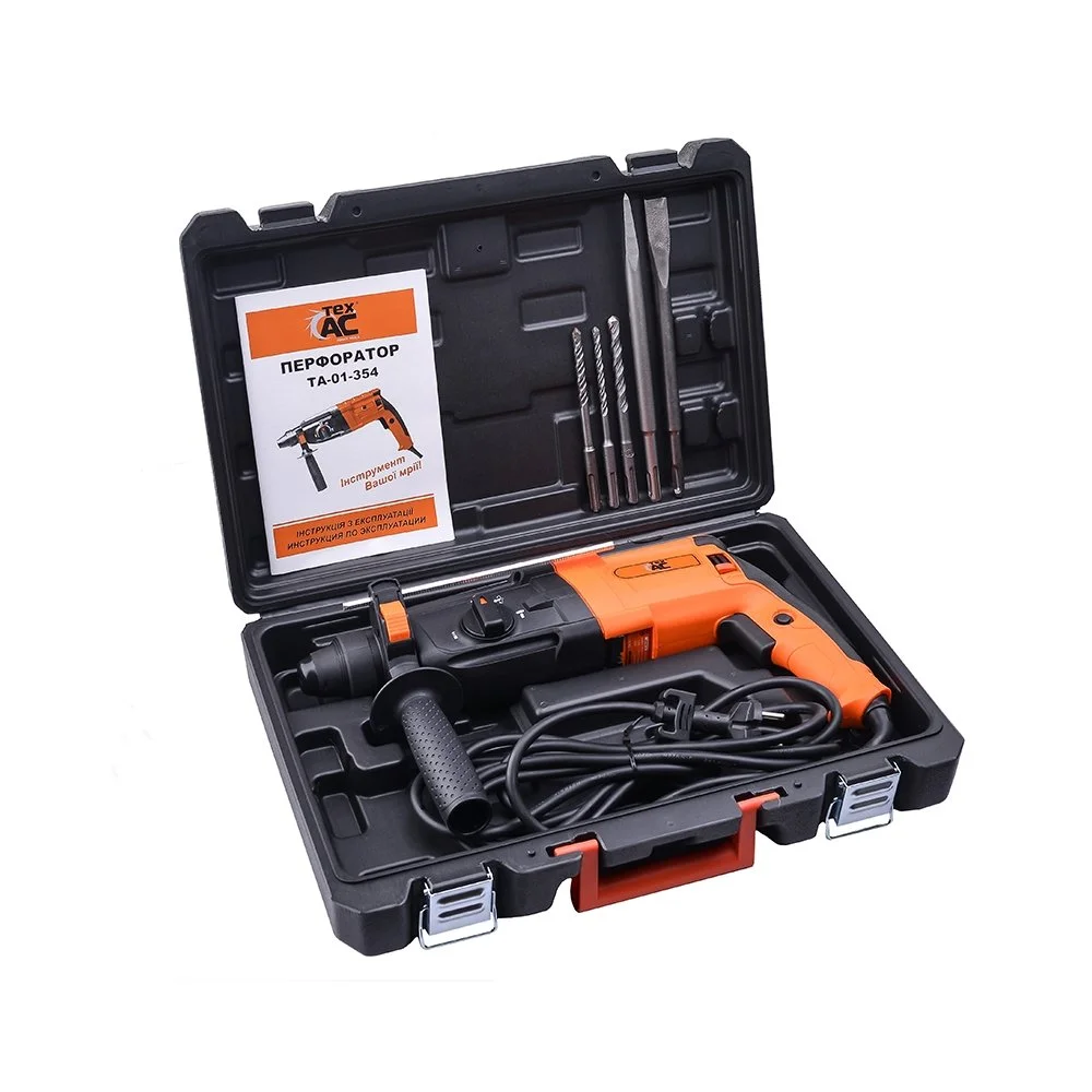 Перфоратор Тех.АС ТА-01-354 поставляется вместе с базовыми аксессуарами. Для выполнения стандартных работ в комплект входит набор буров (6мм, 8мм, 10мм), пика и долото. Для удобства перфоратор комплектуется дополнительной рукояткой, позволяя удерживать перфоратор в необходимом положении. Так же в комплект входит глубиномер, при помощи которого пользователь выставляет необходимую глубину сверления или бурения. Все аксессуары и перфоратор поставляются в кейсе.