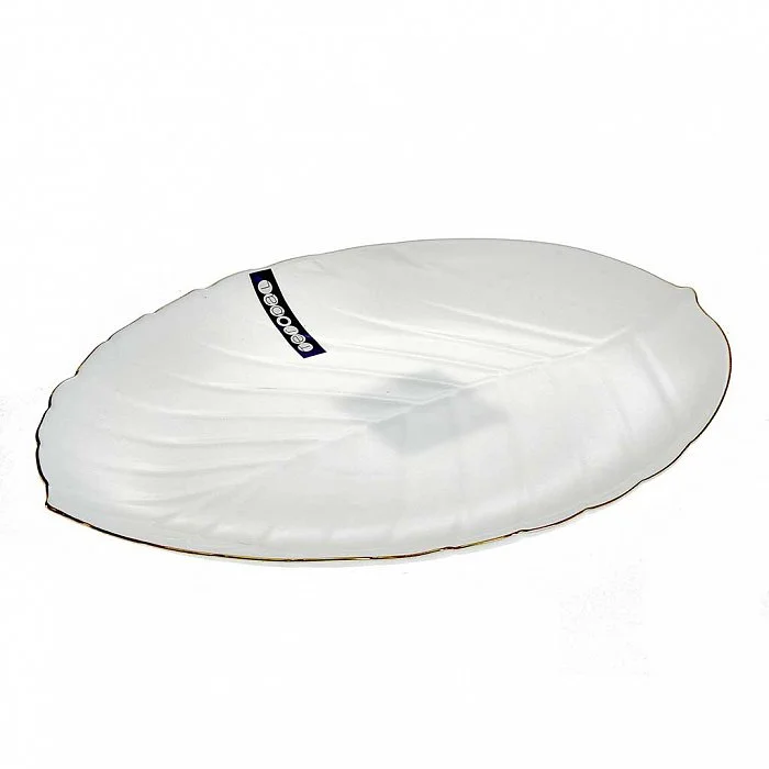 - Блюдо из белой стеклокерамики с рельефным рисунком и золотой обводкой