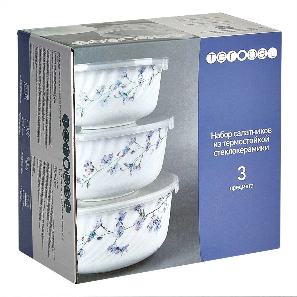 - Набор из 3-х салатников разного объема из термостойкой стеклокерамики с пластмассовыми крышками
