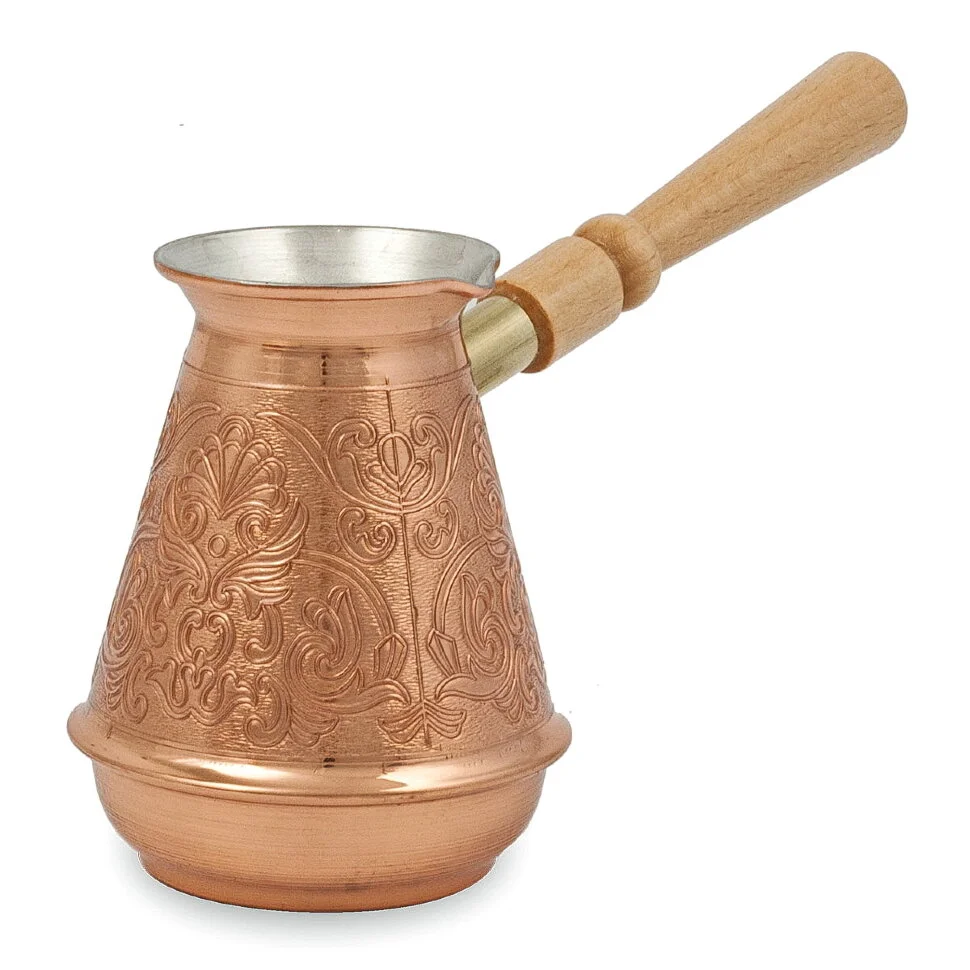 Турка со съемной ручкой Турчанка изготовлена из экологически чистой и высококачественной меди марки М1М. Внутренняя поверхность кофеварки покрыта двойным слоем пищевого олова. Олово нужно для защиты пищи и турки от реакций окисления. Снаружи турка покрыта жаростойким лаком. Подходит для стеклокерамических, газовых и электрических плит. При приготовлении напитка диаметр конфорки должен соответствовать или быть чуть меньше диаметра дна турки, чтобы языки пламени не попадали на стенки корпуса посуды, а нагревали только дно. Ручка прикручивается против часовой стрелки. Объем турки 370 мл.Объем до сужения горлышка - 300мл, вес - 177г, длина ручки - 14,5см, диаметр дна - 5,5см, диаметр по верхнему краю - 5,5см, высота стенки - 10,5см.