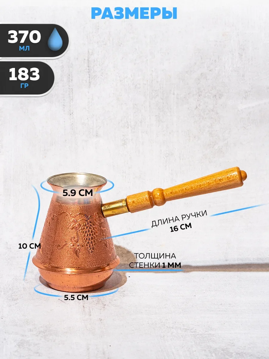 Чтобы приготовить бодрящий напиток по всем правилам, нужна хорошая турка для кофе. Выбирая такую, необходимо учесть все важные параметры: материал, форму, объем, диаметр дна и горлышка. Самые надежные и качественные турки изготавливают из меди. У нее отличная теплопроводность, вода нагревается равномерно по всему объему, и каждая частица помола отдает свой потенциал. Именно поэтому наши кофеварки изготавливаются из меди. При изготовлении корпуса мы соблюдаем правильную форму турки. Золотое правило приготовления кофе по-турецки гласит: диаметр горлышка джезвы должен быть в два раза меньше диаметра дна. У этого правила есть понятное объяснение – зауженное горлышко не позволяет ценным эфирным маслам улетучиться из сосуда. При идеальном приготовлении в районе горлышка образуется пенка, играющая роль своеобразной пробки, препятствующей контакту с воздухом. При правильной разнице дна и горлышка стенки будут наклонными. Наклон способствует опусканию кофейной гущи на дно, что улучшает вкус напитка. Но при всех достоинствах медной посуды, ей свойственно окисляться, поэтому внутреннею часть джезвы мы покрываем защитным покрытием состоящие из двухлористого пищевого олово толщиной в 40 мкм, это покрытие надежное, безопасное для вашего здоровья и не искажает вкус готового напитка. Восточная джезва устойчива к высоким температурам – не плавится на газовой, электрической плите, даже если отвлечься и забыть о приготовлении. Деревянная ручка выполнена из кавказского бука.