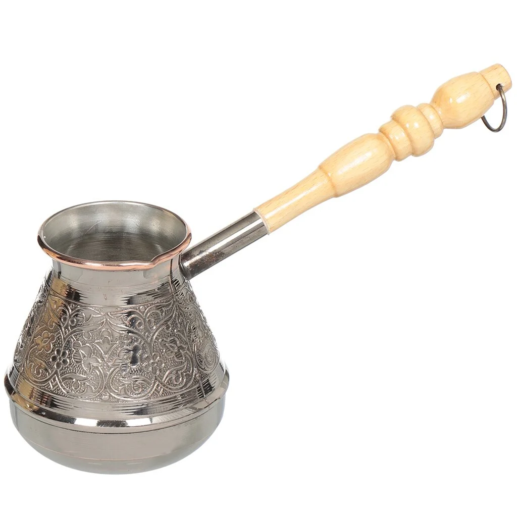 Турка медная — металлическое изделие отечественного производства, предназначенное для приготовления кофе в домашних условиях. Материал аксессуара — натуральная медь — обладает низкой теплопроводностью, поэтому напиток надолго сохраняет температуру. Наружнее лаковое покрытие обеспечивает защиту джезвы от потемнения, в то время как внутренний слой пищевого олова предотвращает образование оксида меди. Благодаря узкому горлышку напиток приобретает пышную пенку. Нескользящая деревянная ручка почти не нагревается, поэтому турка очень удобна в использовании.