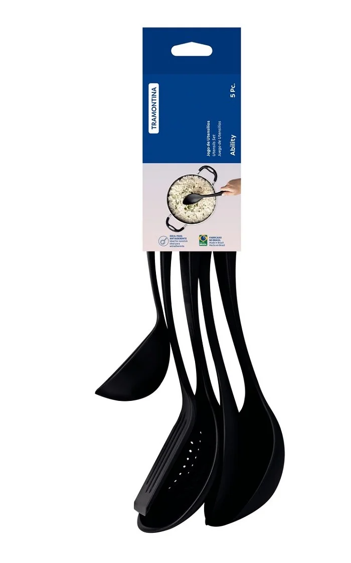 Tramontina Ability Набор кухонных принадлежностей (черный). Кухонные принадлежности из нейлона, которые могут выдержать температуру до 180 градусов. Предназначены для использования с изделиями с антипригарным покрытием Starflon, так как не царапают их. Ну и конечно, для всей остальной посуды с антипригарным покрытием. Ручки с отверстиями для развешивания. Современный дизайн. Можно мыть в посудомоечной машине. Долго сохраняет первоначальный внешний вид.