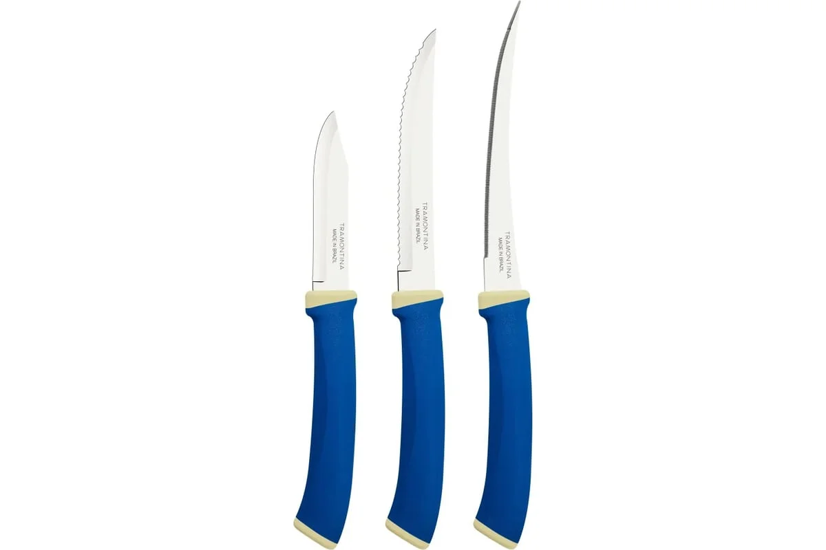 Удобный и практичный набор ножей Tramontina Felice для повседневного использования, который просто необходим на каждой кухне! В наборе маленький нож для очистки овощей (7.5см) и два ножа с лезвием 12.5 см с зубцами (для мяса) и микрозубчиками для томатов, цитрусовых и других мягких продуктов.Ножи с зубчатым лезвием очень удобны для нарезки хлеба, стейков, замороженных продуктов, сыра, помидоров. Позволяют легко нарезать продукты с твердой кожицей и нежной мякотью, не помяв мягкой сердцевины. Нож с волнистым лезвием не требует заточки, служит десятилетиями. Лезвия ножей из нержавеющей стали марки AISI 420, которая прошла термическую обработку и поэтому обладает повышенной прочностью - т.е. требует более редкой правки и заточки, что обеспечивает более долгий срок службы по сравнению с изделиями из аналогичной стали других производителей. И к тому же не боится коррозии, не абсорбирует запахи, предотвращает размножение бактерий. Полипропиленовые ручки не скользят и благодаря эргономичной форме удобно лежат в руке.