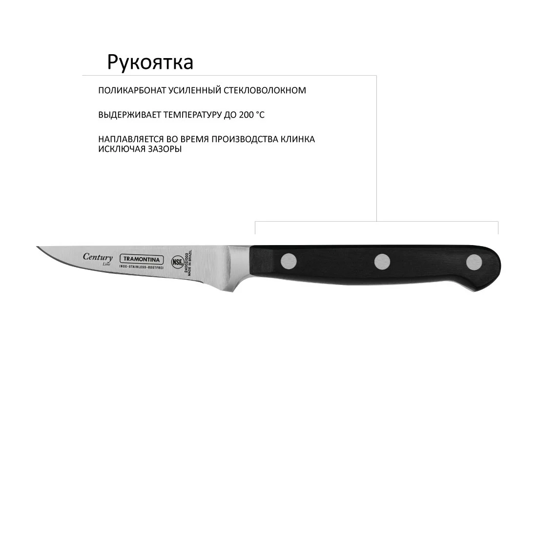 Рукоятка ножа Century из поликарбоната, который по сравнению с широко используемым бакелитом, более долговечен, надежен и выдерживает более высокие температуры (200ºC по сравнению со 170ºC бакелита)