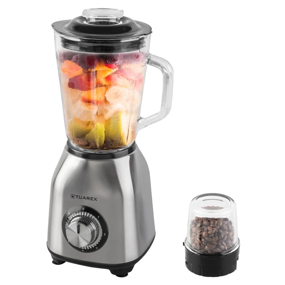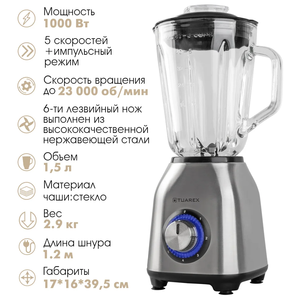 Представляем вашему вниманию стильный и функциональный настольный блендер TUAREX TK-4201, который станет вашим незаменимым помощником на кухне! Обладая мощностью 1000 Вт и шестью стальными лезвиями, он без труда справится с любыми кулинарными задачами.
