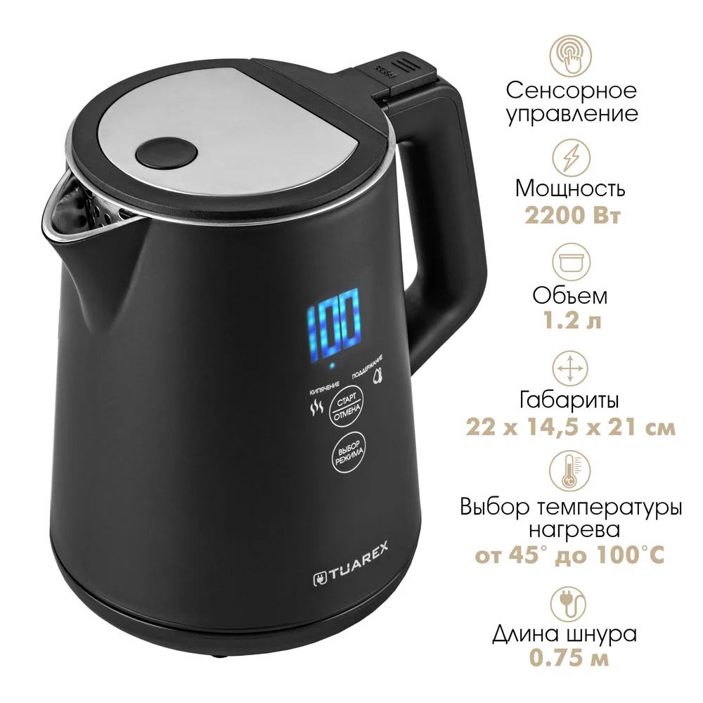 Представляем вам новый чайник Tuarex TK-8004, который удивит вас своей функциональностью и современным дизайном! Электрический чайник с мощностью 2200 Вт обеспечит быстрый нагрев воды, позволяя вам наслаждаться чашкой горячего чая в считанные минуты.
