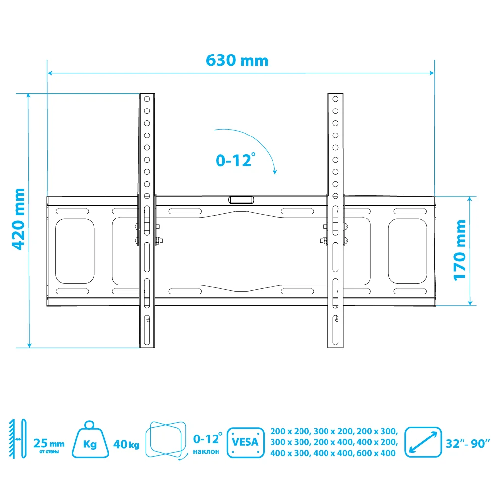 TUAREX OLIMP-112 BLACK надёжно удержит экран размером 32"-90" дюйма и весом 40 кг. Простая конструкция TUAREX OLIMP-112 BLACK идеально подойдет для самостоятельного монтажа. Наклонная конструкция регулировать экран вверх и вниз на 0 -12°.