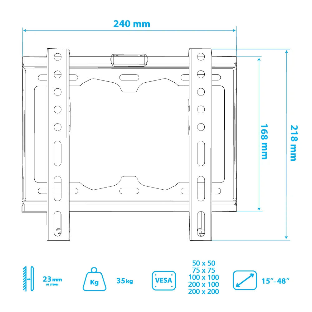 Фиксированный кронштейн сделан из стали, подходит для LED/LCD телевизоров. Диагональ экрана от 15 до 48 дюймов (38-122 см) с максимальным нагрузкой до 35 кг и с расстоянием от стены 23 мм. Однако этого расстояния достаточно для того, чтобы подключить все необходимые кабеля, штекеры и шнуры.